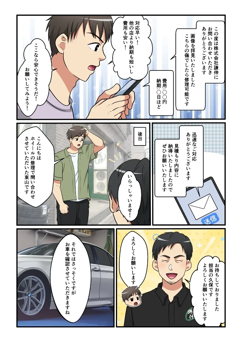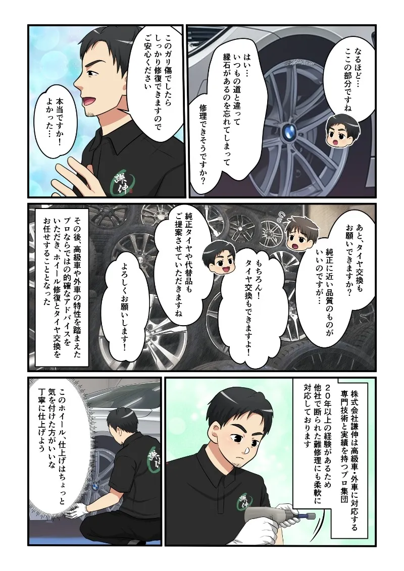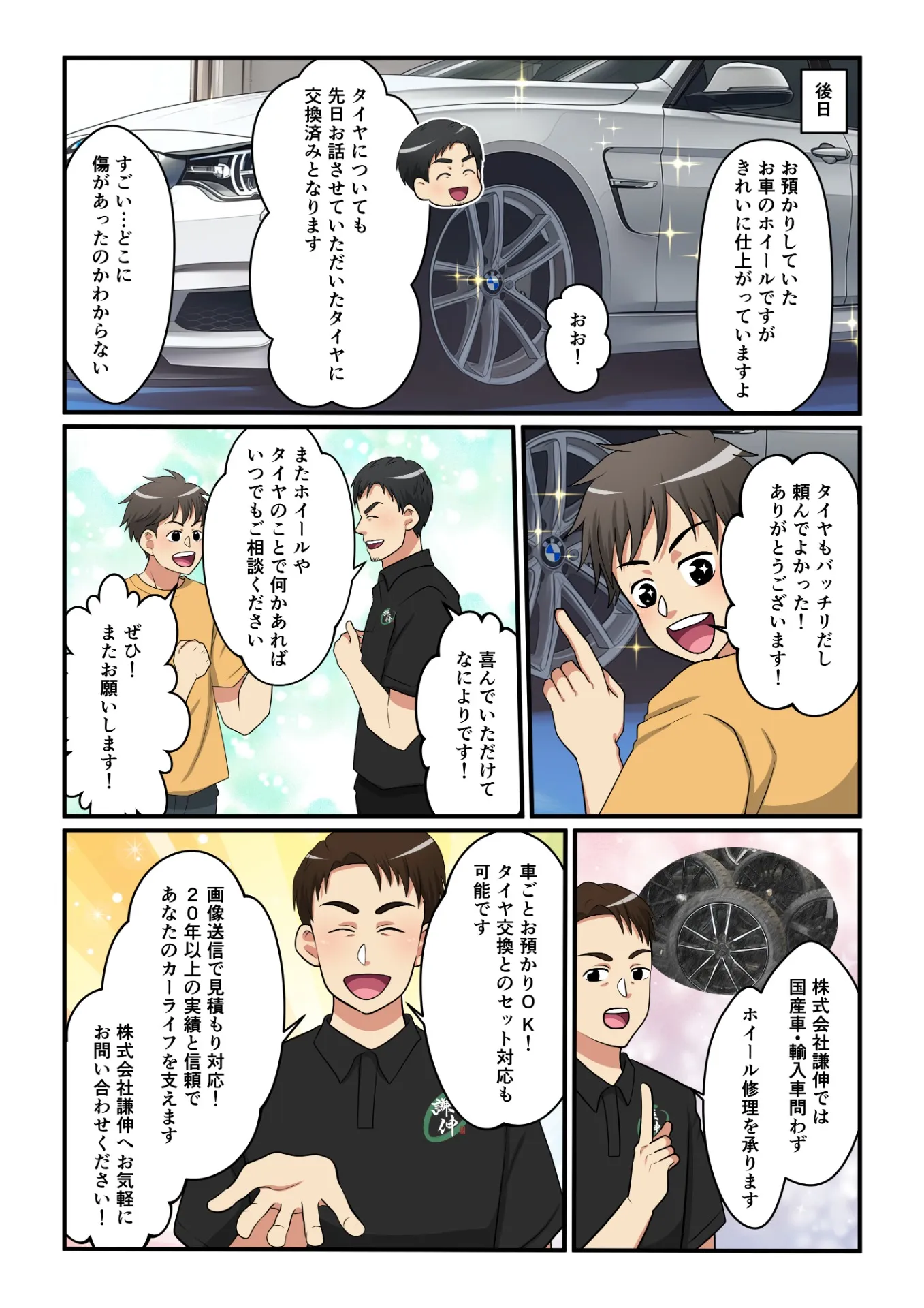 主人公「その後、高級車や外車の特性を踏まえたプロならではの的確なアドバイスをいただき、ホイール修復とタイヤ交換をお任せすることとなった」