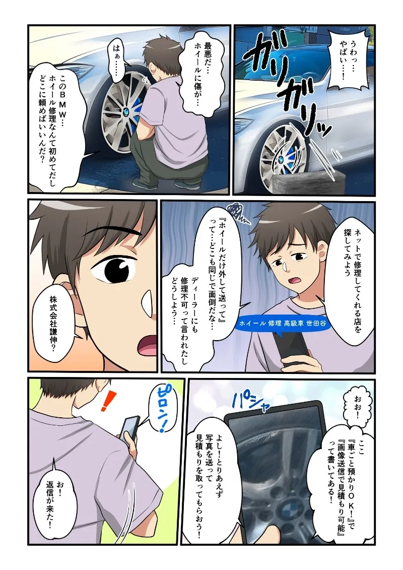 主人公「うわっ…やばい…!」主人公「最悪だ…ホイールに傷が…」主人公「はぁ……」主人公「この車BMW…ホイール修理なんて初めてだし、どこに頼めばいいんだ?」主人公「ネットで修理してくれる店を探してみ…